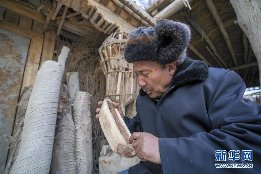 在羅布人村寨,阿木東·艾不東在家中制作卡盆模型(1月29日攝)。新華社記者 趙戈 攝