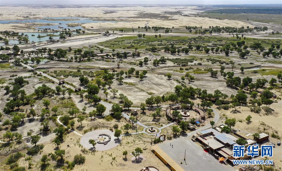從空中俯瞰位于尉犁縣的羅布人村寨(6月19日無人機拍攝)。新華社記者 趙戈 攝