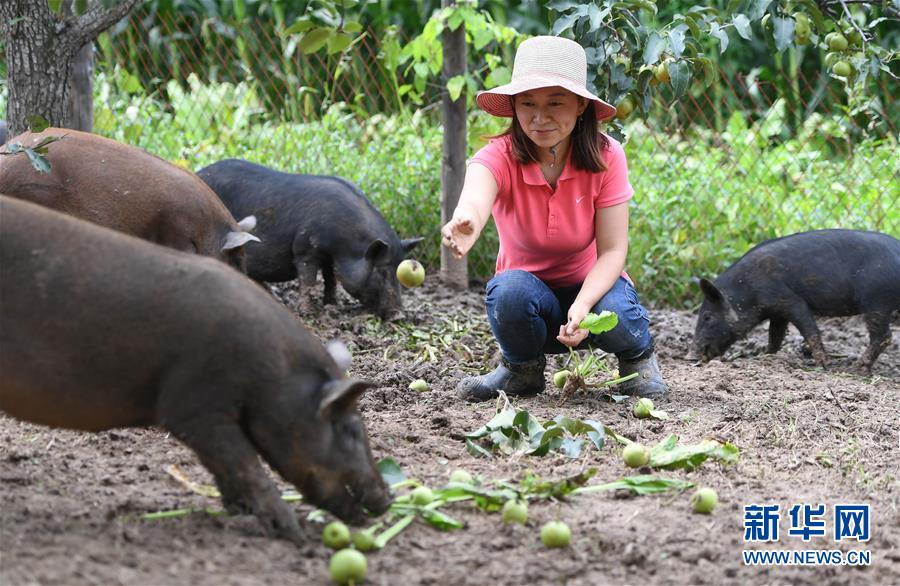 8月20日,康丹丹在果園內(nèi)喂豬吃蘋(píng)果梨。新華社記者 王昊飛 攝