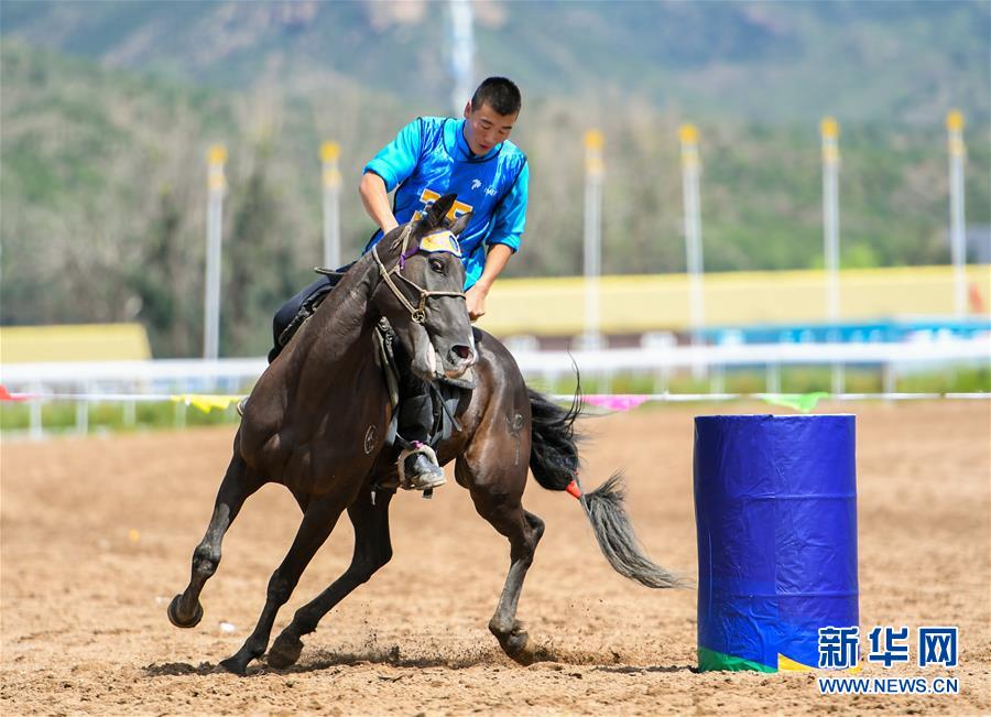 8月20日,騎手在“蒙古馬”傳統(tǒng)技巧表演中展示騎馬繞桶。 新華社記者 彭源 攝