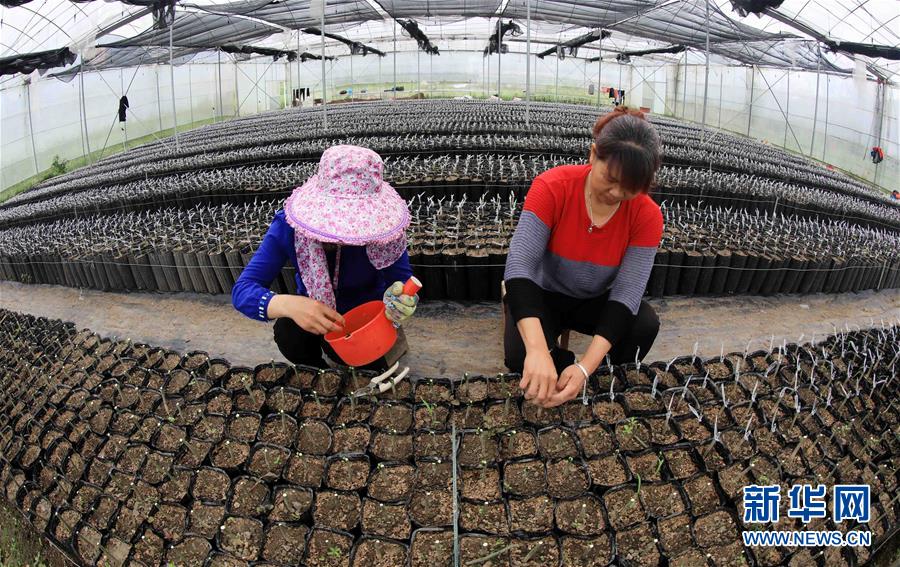 在廣西融安縣大良鎮(zhèn)古蘭村古蘭屯大棚基地,村民在嫁接金桔苗(4月12日攝)。 新華社記者 黃孝邦 攝