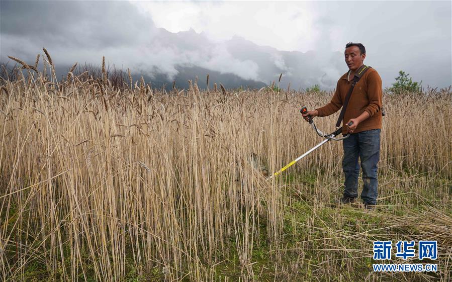 乃村村委會主任多吉頓珠在自家田地里收割小麥(8月26日攝)。新華社記者 多吉占堆 攝