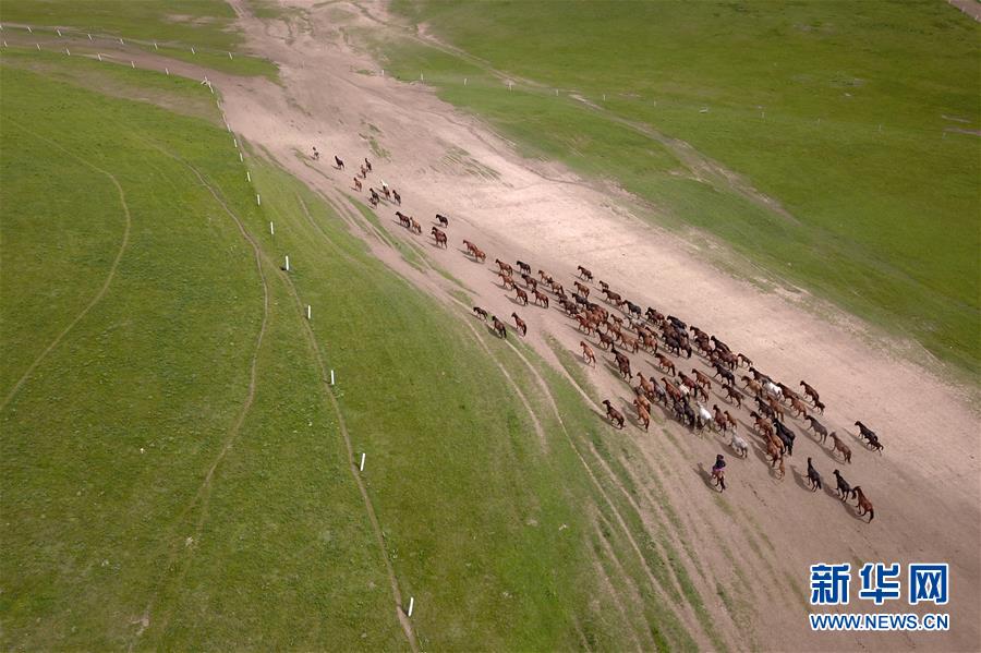 山丹馬場(chǎng)上的馬群(7月17日無(wú)人機(jī)拍攝)。新華社記者 范培珅 攝