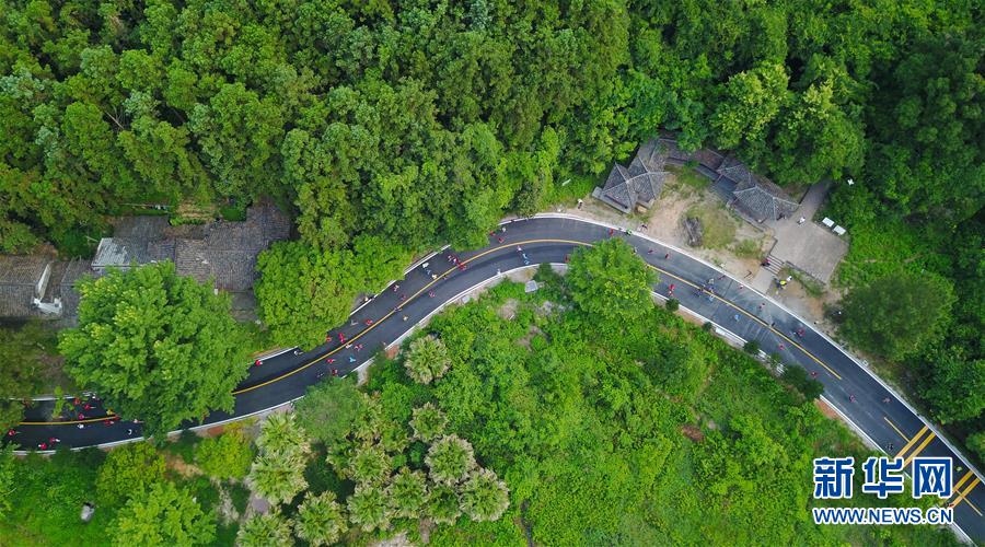 參加首屆丹霞山半程馬拉松的選手們?cè)诹珠g穿梭(2018年5月27日無(wú)人機(jī)拍攝)。 新華社記者 鄧華 攝