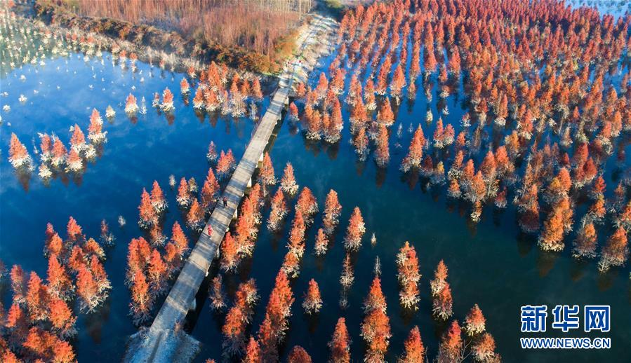 云南昆明水杉濕地冬日一景(1月5日無人機(jī)拍攝)。 新華社記者 秦晴 攝