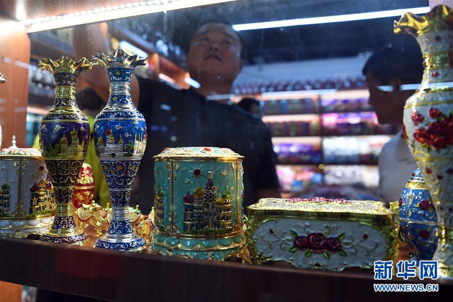 9月4日,在新疆塔城地區(qū)巴克圖口岸,顧客在絲路文化商品城內(nèi)選購商品。 新華社記者沙達提攝