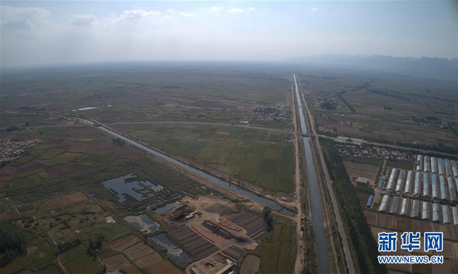 9月4日無人機拍攝的河套灌區(qū)第三排干溝(左)排水排入總排干溝(右)。 新華社記者 劉詩平 攝