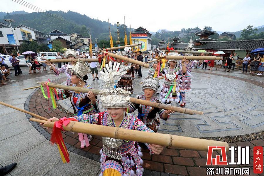 在廣西柳州市融安縣安寧村大袍屯,苗族群眾在“鬧魚”活動(dòng)中表演蘆笙踩蹚舞。