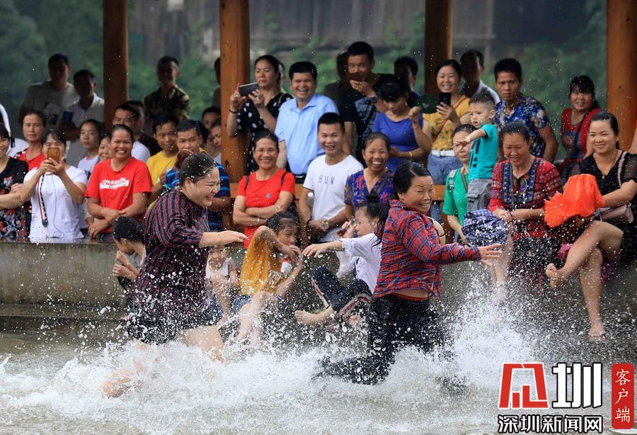 在廣西柳州市融安縣長安鎮(zhèn)安寧村大袍屯,人們?cè)谒匣@球比賽中拼搶。