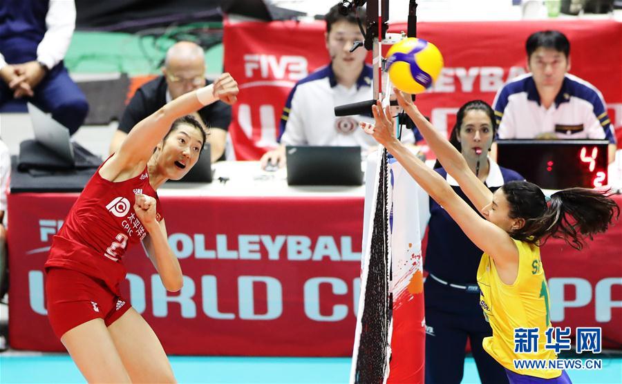 9月22日,中國隊(duì)球員朱婷(左)在比賽中扣球。當(dāng)日,在日本札幌舉行的2019年女排世界杯賽第二階段A組循環(huán)賽比賽中,中國隊(duì)以3比2戰(zhàn)勝巴西隊(duì)。新華社記者杜瀟逸攝