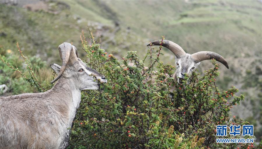 兩只巖羊在西藏山南市洛扎縣色鄉(xiāng)海拔4000米左右的盤山路邊,悠閑地吃著野果青草(9月22日攝)。 在西藏山南市洛扎縣色鄉(xiāng)海拔4000米左右的盤山路上,一群巖羊悠閑地吃著野果青草,完全不介意來往的車輛、行人和近在咫尺的鏡頭。 巖羊是國家二級保護動物。近年來,隨著西藏生態(tài)保護力度加大,巖羊數(shù)量不斷增加。 新華社記者 晉美多吉 攝