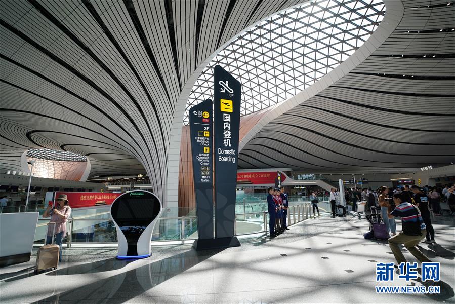 9月25日,乘客在北京大興國際機(jī)場航站樓內(nèi)登機(jī)。新華社記者張晨霖?cái)z