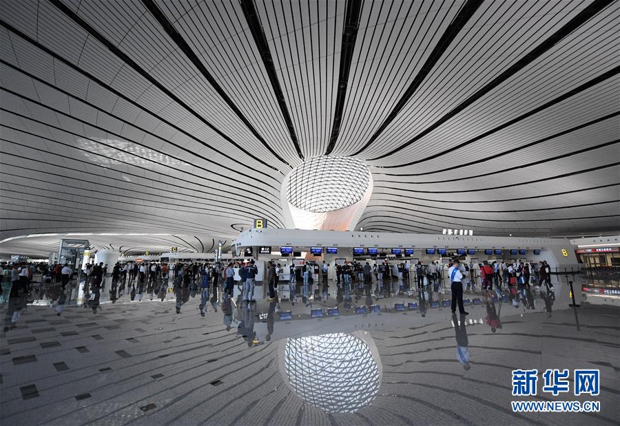 9月25日,中國南方航空公司的CZ3001次航班從北京大興國際機(jī)場起飛。當(dāng)日,北京大興國際機(jī)場正式通航。北京大興國際機(jī)場位于北京市大興區(qū)和河北省廊坊市廣陽區(qū)之間,與天安門直線距離為46公里,是目前全球建設(shè)規(guī)模最大的新建機(jī)場。新華社記者鞠煥宗攝