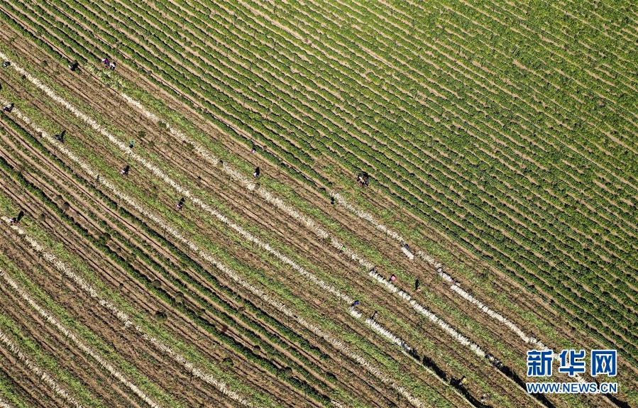 9月30日,寧夏吳忠市紅寺堡區(qū)馬渠生態(tài)移民安置區(qū)的農民在蘿卜地里勞作(無人機拍攝)。 新華社記者 馮開華 攝
