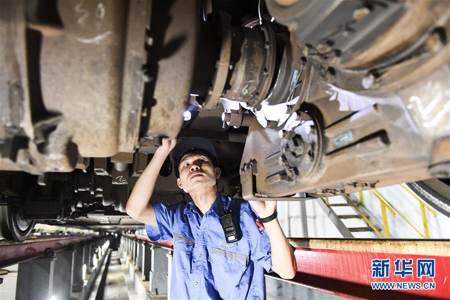 “動車醫(yī)生”們在南寧動車所檢查庫內(nèi)忙碌(10月2日攝)。 新華社記者 曹祎銘 攝