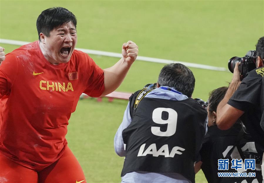 當日,在卡塔爾多哈舉行的2019國際田聯(lián)世界田徑錦標賽女子鉛球決賽中,衛(wèi)冕冠軍、中國選手鞏立姣以19米55的成績奪得冠軍。 新華社記者王麗莉攝