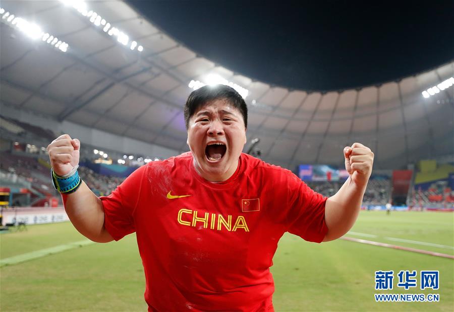 當(dāng)日,在卡塔爾多哈舉行的2019國際田聯(lián)世界田徑錦標(biāo)賽女子鉛球決賽中,衛(wèi)冕冠軍、中國選手鞏立姣以19米55的成績奪得冠軍。 新華社記者王麗莉攝