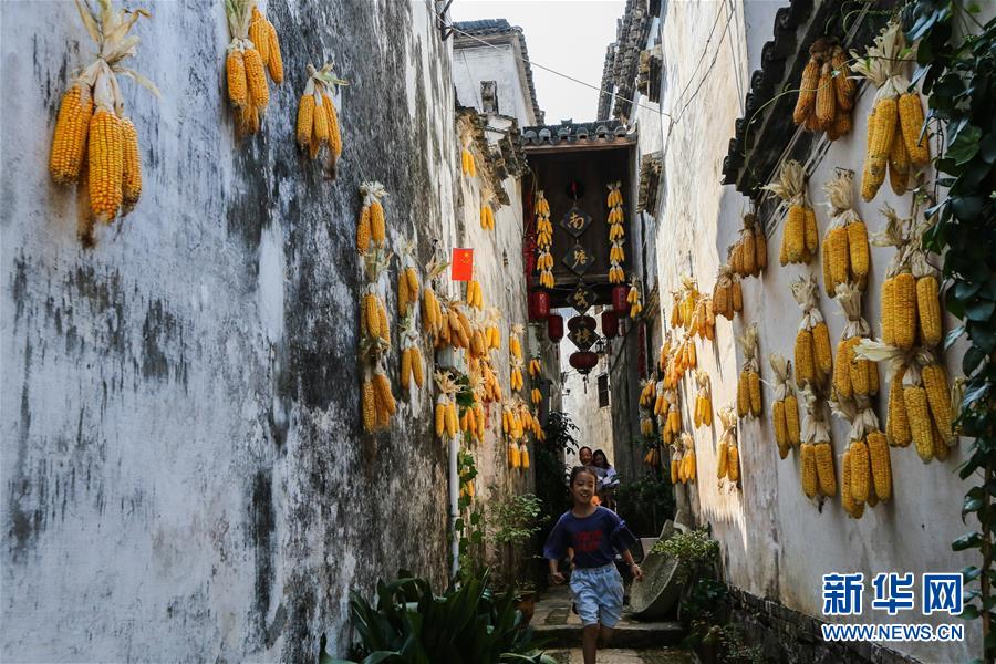 10月5日,游客在新葉古村的巷子內(nèi)觀賞美景。新華社記者徐昱攝