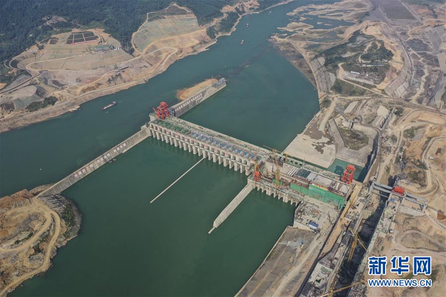 建設(shè)中的大藤峽水利樞紐工程(10月6日無人機(jī)拍攝)。節(jié)日期間,工人們?cè)谖挥趶V西桂平市西江流域黔江河段的大藤峽水利樞紐工程現(xiàn)場(chǎng)加緊施工。新華社記者曹祎銘攝