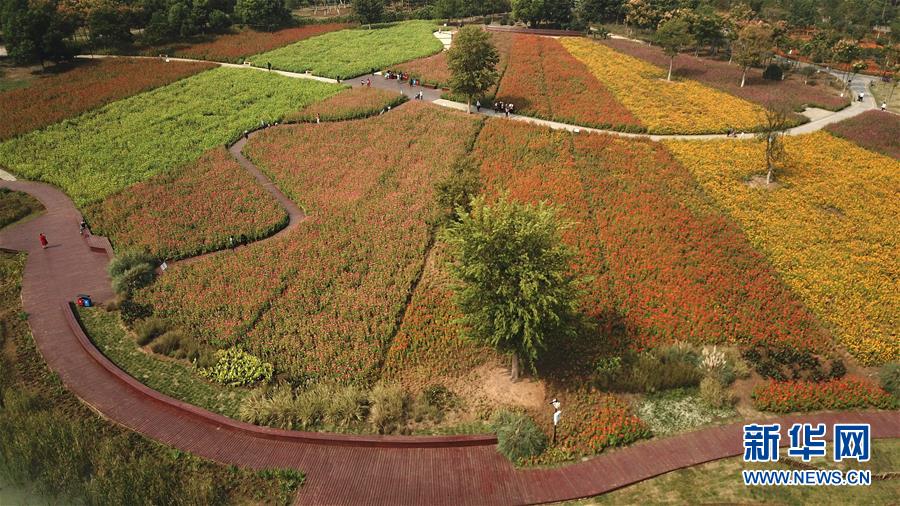 10月9日,游人在四季花海城市公園游覽(無人機拍攝)。 秋日時節(jié),位于安徽省合肥市的四季花海城市公園花香四溢,色彩繽紛,成為游客和市民休閑游玩的好去處。 新華社記者 張端 攝