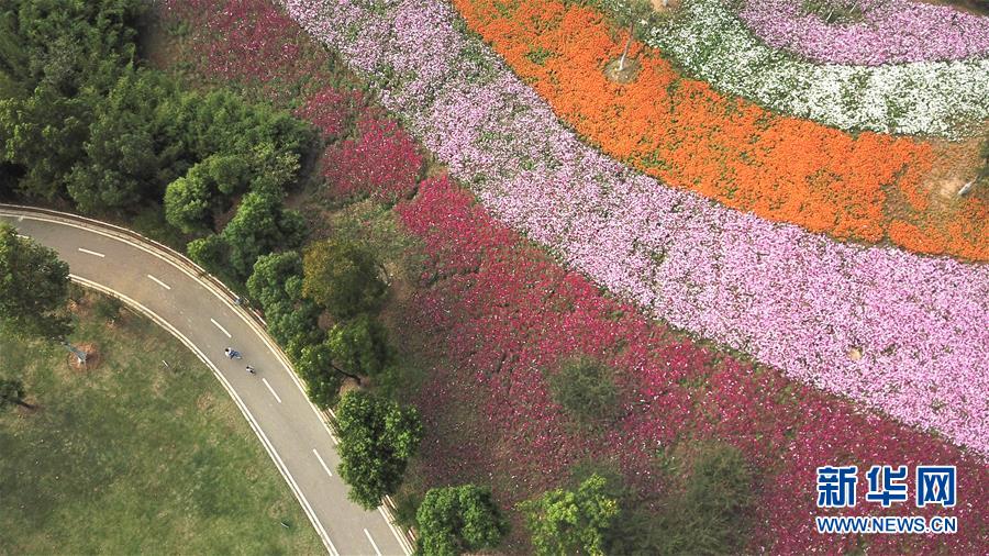 10月9日無(wú)人機(jī)拍攝的四季花海城市公園風(fēng)景。 秋日時(shí)節(jié),位于安徽省合肥市的四季花海城市公園花香四溢,色彩繽紛,成為游客和市民休閑游玩的好去處。 新華社記者 張端 攝