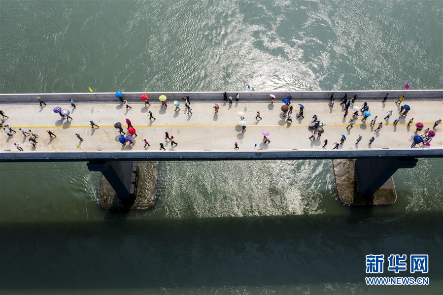 10月12日,福建省霞浦縣東安島海防大橋正式通車,這是當(dāng)?shù)厝罕娮咴谛聵蛏希o人機(jī)拍攝)。新華社記者姜克紅攝