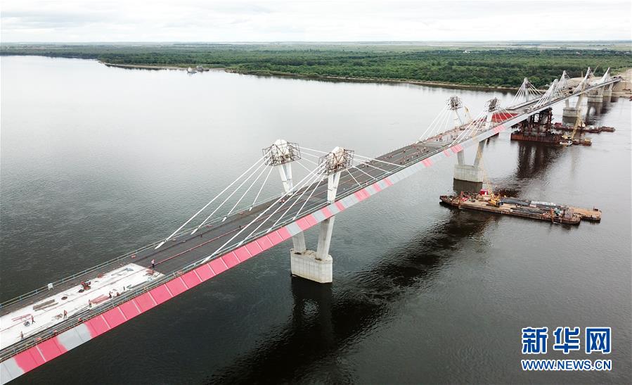 正在進(jìn)行橋面鋪裝施工作業(yè)的黑河到布拉戈維申斯克黑龍江(阿穆爾河)大橋(8月19日無人機(jī)拍攝)。新華社記者王建威攝