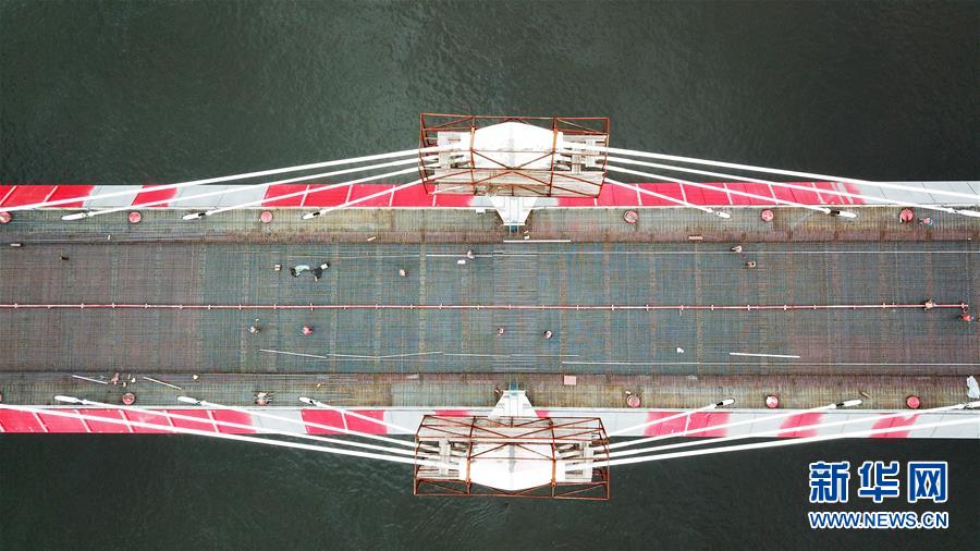 正在進(jìn)行橋面鋪裝施工作業(yè)的黑河到布拉戈維申斯克黑龍江(阿穆爾河)大橋(8月19日無人機拍攝)。新華社記者王建威攝