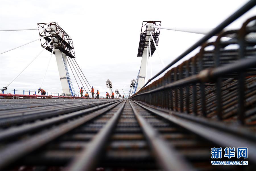 工人在大橋上進(jìn)行橋面鋪裝施工作業(yè)(8月19日攝)。新華社記者王建威攝
