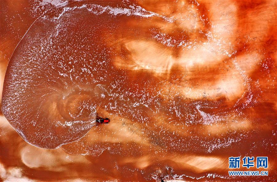 魯北鹽場(chǎng)工人在鹽池中收獲海鹽(10月9日無(wú)人機(jī)拍攝)。新華社記者 朱崢 攝