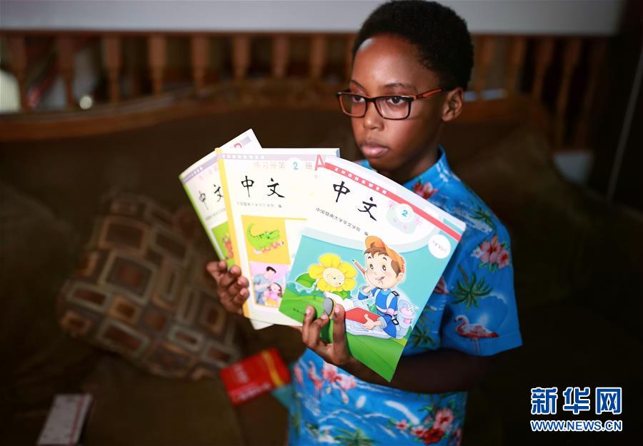 9月25日,在美國芝加哥,卡亞·恩朱比展示漢語課本。 新華社記者 汪平 攝