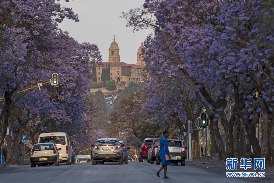 10月13日,在南非比勒陀利亞,行人從藍(lán)花楹樹下走過。