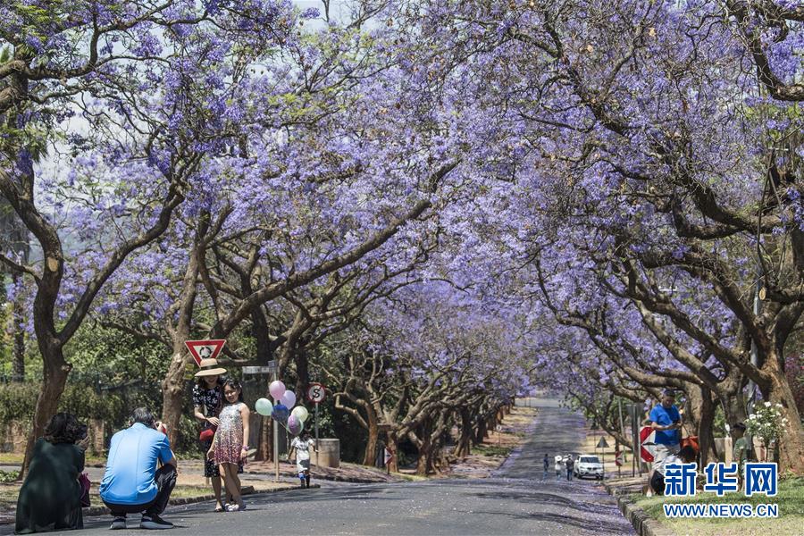 10月20日,在南非比勒陀利亞,游人在藍(lán)花楹樹下拍照。新華社記者陳誠(chéng)攝