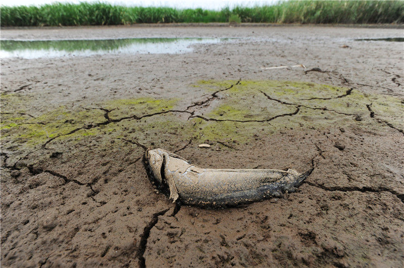 2011年9月21日,江西鄱陽(yáng)湖,一條沒(méi)來(lái)及逃離的魚(yú)干死在河床上。