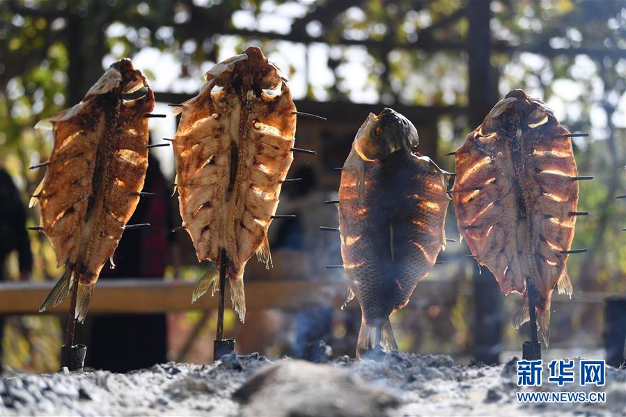 10月26日在新疆阿瓦提縣刀郎部落景區(qū)拍攝的烤魚。新華社記者沙達提攝