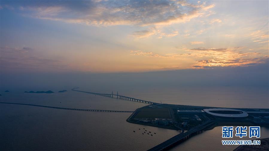 晨曦中的港珠澳大橋珠澳口岸人工島(10月24日無(wú)人機(jī)拍攝)。2018年10月23日,港珠澳大橋正式開通。在這座圓夢(mèng)橋、同心橋、自信橋、復(fù)興橋開通一周年之際,記者親自體驗(yàn)“一橋連三地、一日游三城”的悠閑與便利,于不同的旖旎風(fēng)光中自在游覽,在不同的城市風(fēng)貌間自如切換。新華社記者張金加攝
