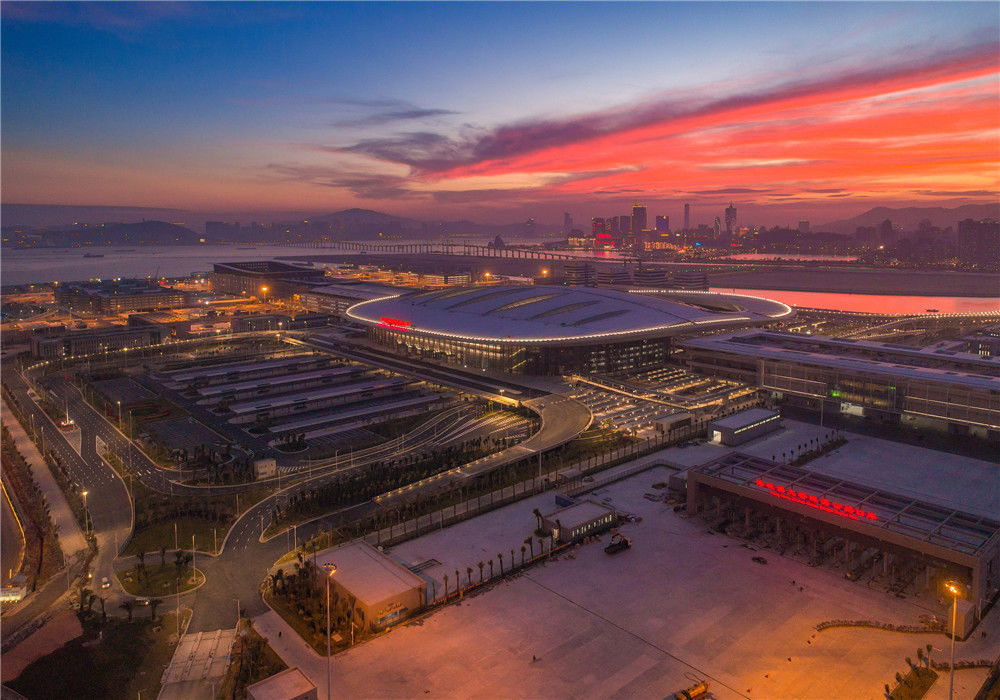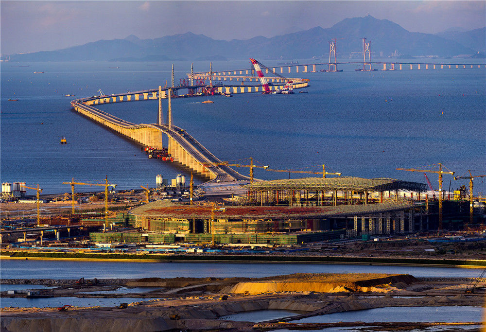 晨曦中的港珠澳大橋珠澳口岸人工島(10月24日無人機拍攝)。2018年10月23日,港珠澳大橋正式開通。在這座圓夢橋、同心橋、自信橋、復(fù)興橋開通一周年之際,記者親自體驗“一橋連三地、一日游三城”的悠閑與便利,于不同的旖旎風光中自在游覽,在不同的城市風貌間自如切換。新華社記者張金加攝