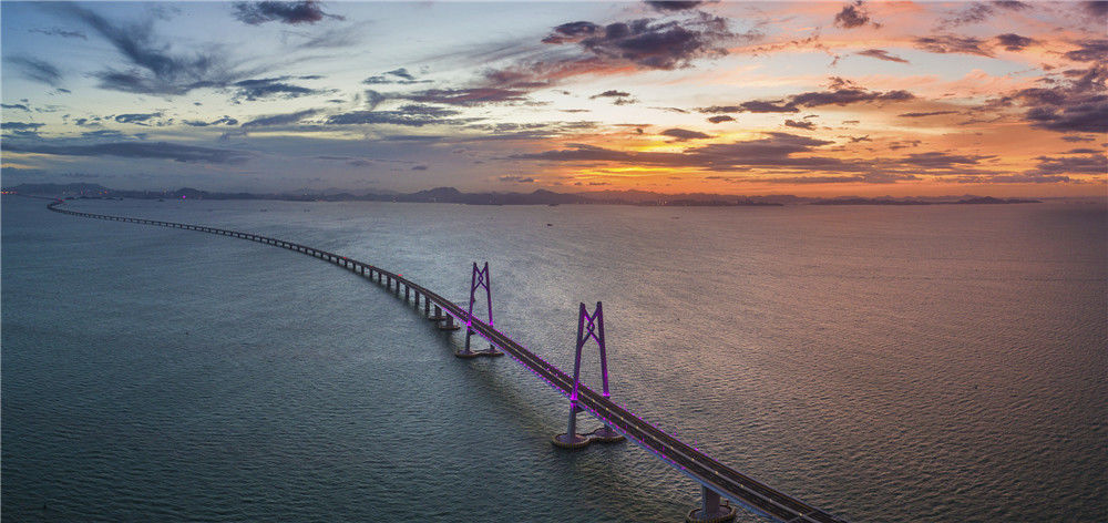 2018年7月18日,廣東珠海,滿天紅霞,亮燈后的港珠澳大橋跨立在伶仃洋上,進入通車前的最后準備。張由瓊/視覺中國