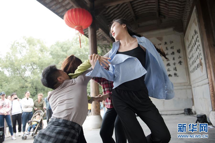 10月26日,一個(gè)劇團(tuán)在烏鎮(zhèn)街頭表演戲劇。 新華社記者翁忻旸攝