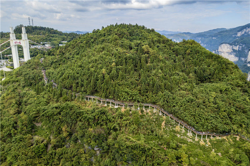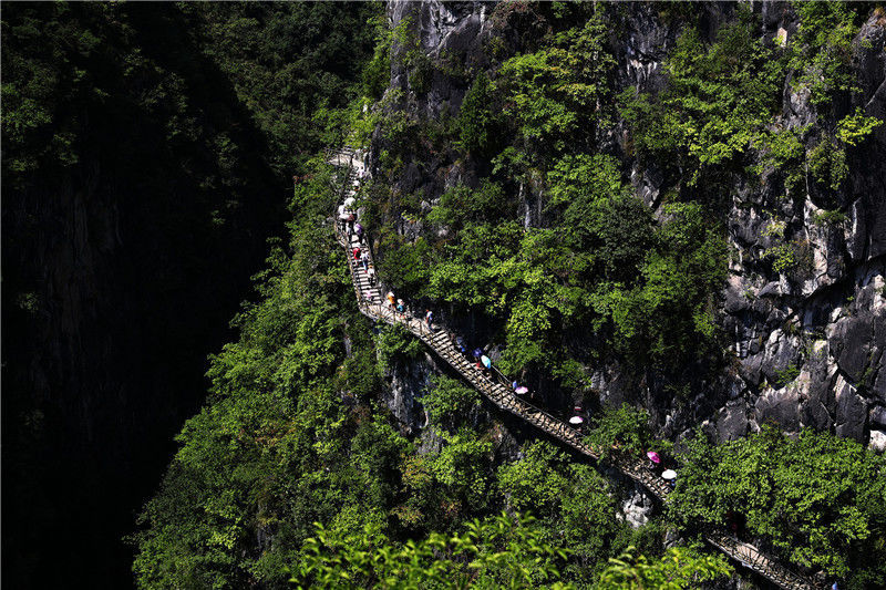 2019年9月13日,游客在重慶市黔江區(qū)城市峽谷景區(qū)芭拉胡的懸崖棧道上游玩。當(dāng)天是中秋節(jié)假的第一天。楊敏/視覺中國(guó)編輯/陳進(jìn)