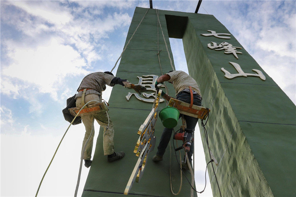 2019年9月20日,從落差198米懸崖上伸出周長(zhǎng)60米懸空的“高空玻璃懸廊”在河南南陽(yáng)七峰山落成,該玻璃懸廊名為“云頂之心”。圖為建筑工人進(jìn)行收尾工作。王中舉(河南分社)/中新社/視覺中國(guó)編輯/康娜