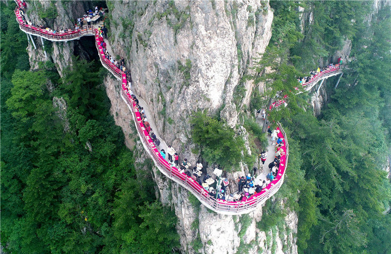 2019年6月24日,河北省邯鄲市東太行云端棧道天脊攬勝。東太行景區(qū)位于武安市境內(nèi)太行山東麓,登山棧道全部在峭壁上,游人登山如在云端漫步。金書懷/視覺中國(guó)