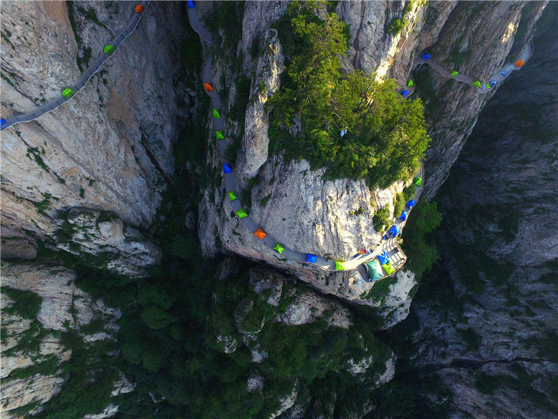 2018年7月21日,河南洛陽(yáng)老君山,一年一度的帳篷節(jié)開幕,驢友在海拔2000余米的懸崖棧道上安營(yíng)扎寨。DF/視覺中國(guó)