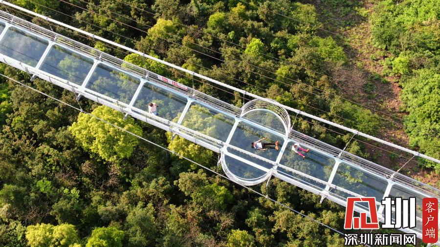 2019年4月24日,湖南張家界大峽谷玻璃橋上,游客們擺出各種姿勢(shì)拍照。剛開始,游客們?cè)诙虝旱目謶种?,隨之而來(lái)的是滿滿的興奮,男女老少紛紛在這座懸在300多米高空中的全透明玻璃橋上不停拍照,從一開始走上橋緊張的不敢踩在玻璃上,到最后在玻璃橋上的各種躺和趴,各種姿勢(shì)各種創(chuàng)意各種拍攝,游客們完全忘我地開心游玩。張家界大峽谷玻璃橋,是世界首座斜拉式高山峽谷玻璃橋,玻璃橋全長(zhǎng)430米,寬6米,橋身距離谷底垂直落差300米,大橋表面由99塊透明玻璃鋪設(shè)而成,整個(gè)工程無(wú)鋼筋混凝土橋墩。