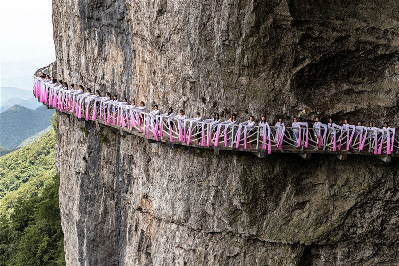 2018年7月29日,水袖舞愛好者在重慶市南川區(qū)金佛山絕壁棧道上“秀”水袖舞。瞿明斌/視覺中國(guó)