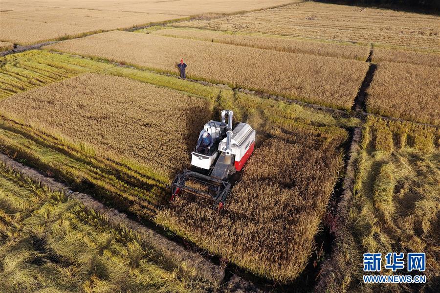 在太原市晉源區(qū)赤橋村,收割機(jī)在稻田里作業(yè)(10月28日無人機(jī)拍攝)。新華社記者詹彥攝