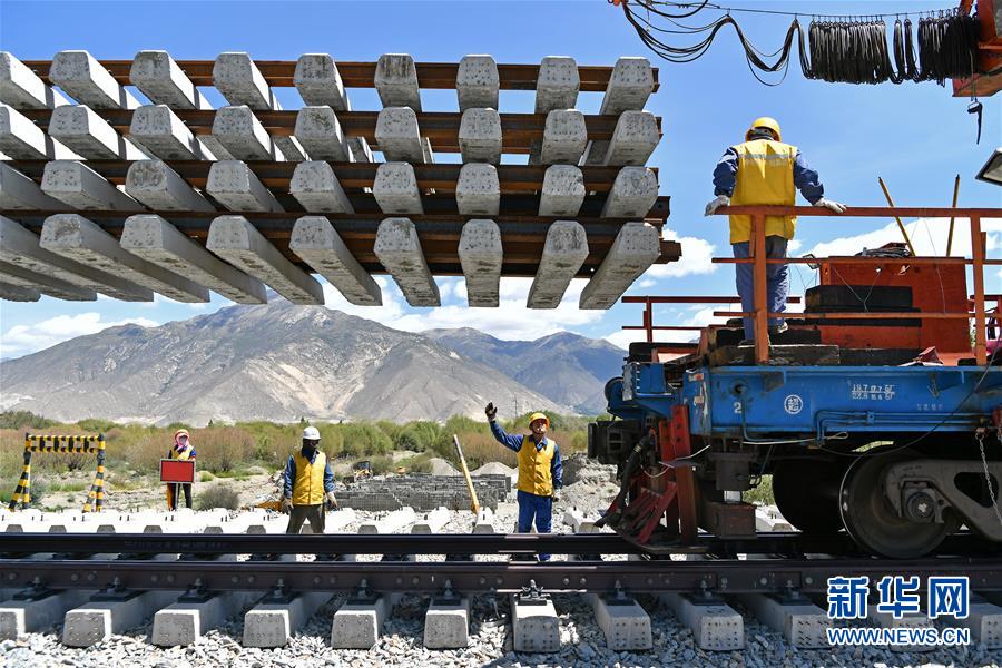 6月6日,負責鋪軌的中鐵十一局集團的建設者在現(xiàn)場作業(yè)。新華社記者李鑫攝
