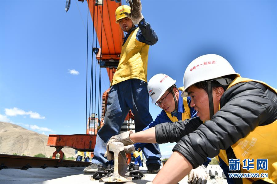 6月6日,負責(zé)鋪軌的中鐵十一局集團的建設(shè)者在現(xiàn)場作業(yè)。新華社記者李鑫攝
