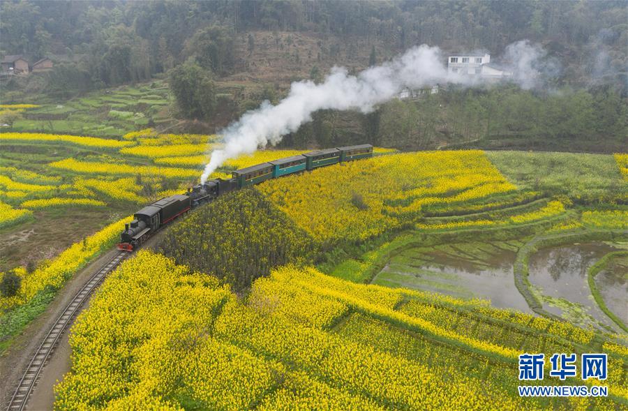 3月20日,一列嘉陽(yáng)小火車(chē)在油菜花叢中穿行(無(wú)人機(jī)拍攝)。