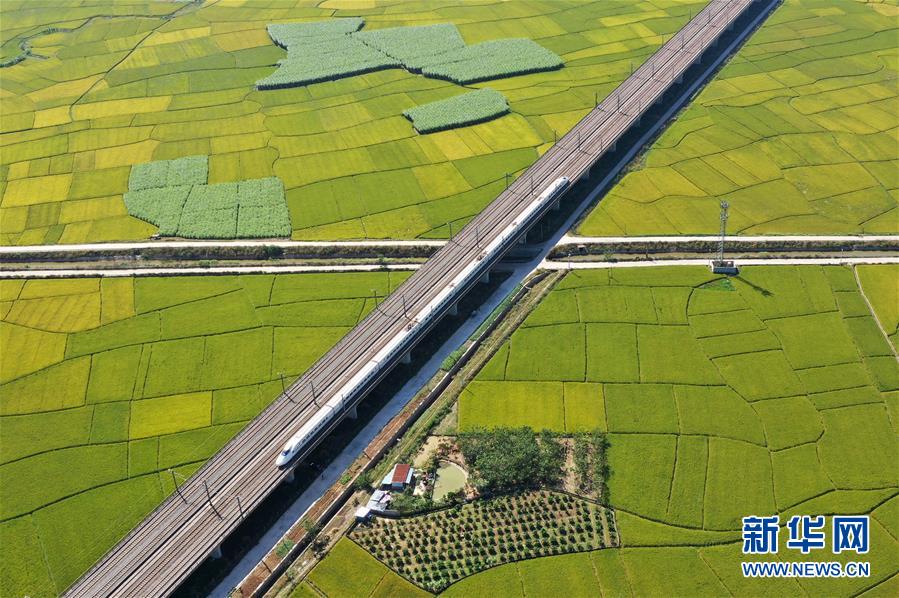 10月29日,列車從廣西賓陽(yáng)縣古辣鎮(zhèn)豐收的稻田間駛過(guò)(無(wú)人機(jī)拍攝)。新華社記者陸波岸攝